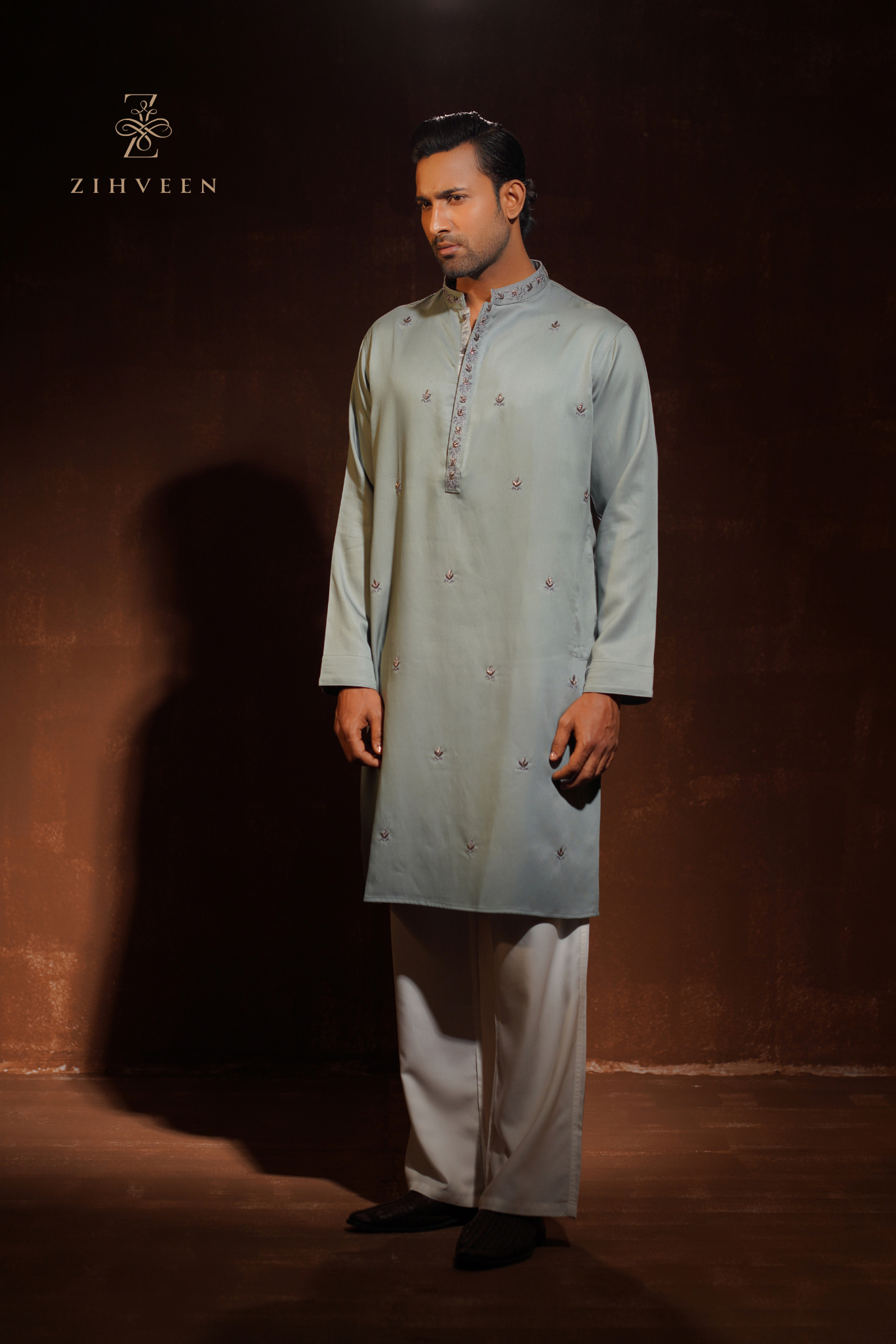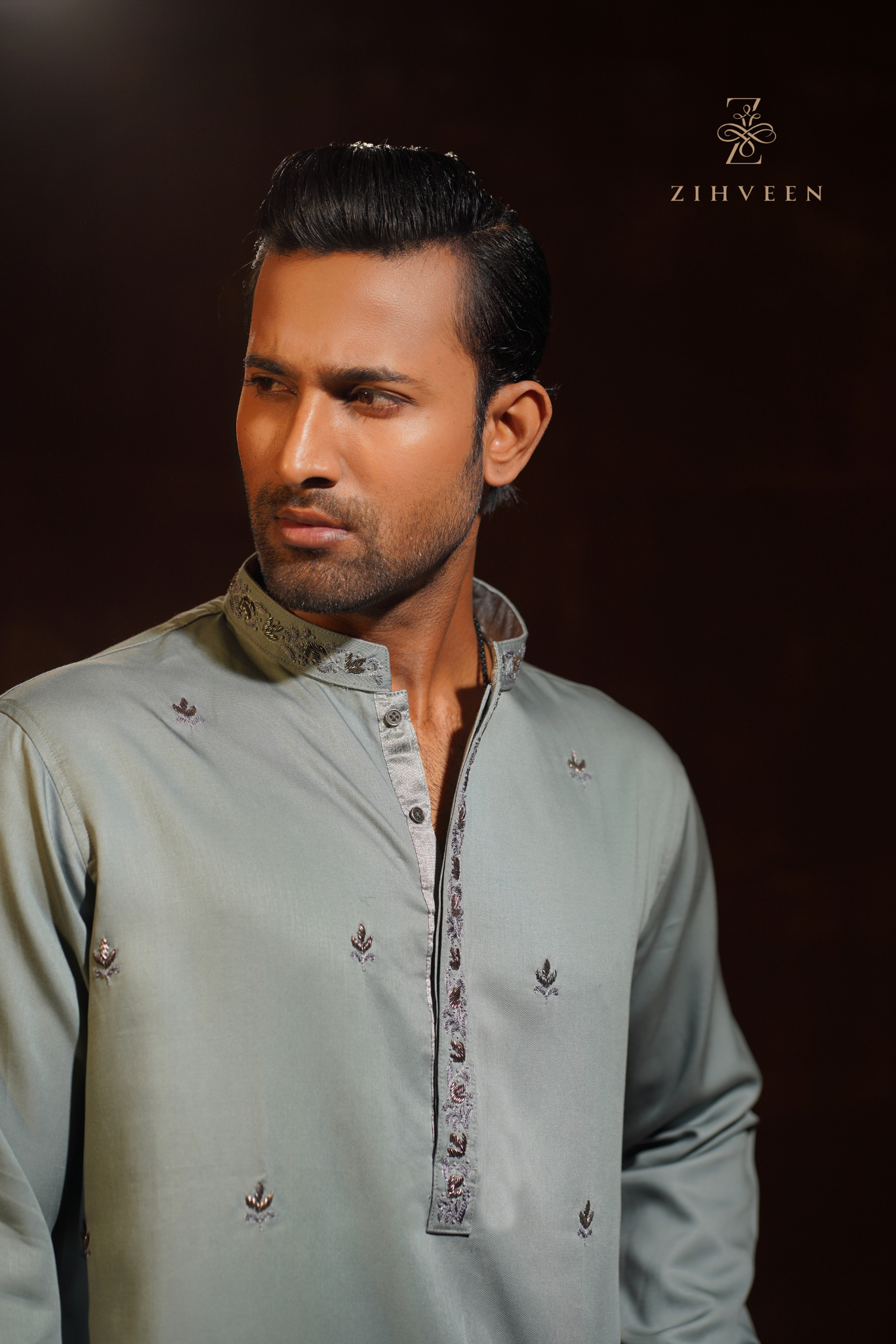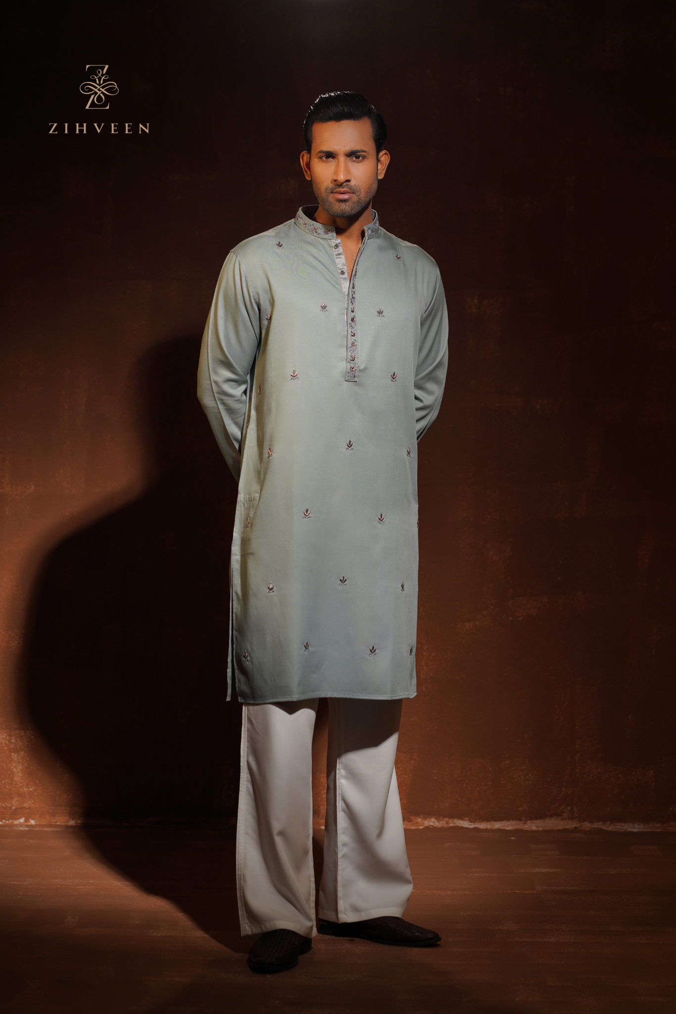 Exclusive Topez Green with allover motif zardoji & collar-button zardoji